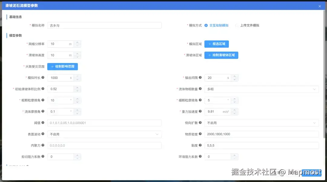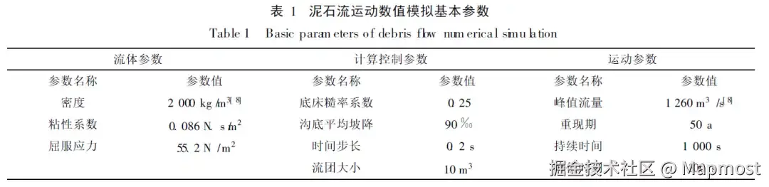在配置参数时,我们采用了10米分辨率DEM,并采用**《西藏古乡沟泥石流的数值模拟》**文献中的相关数据。