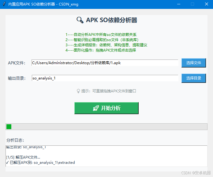 在rom中遇到此类问题。根据实际需要。手搓了一个分析apk中依赖库文件的图形化小工具。用于分析一些特殊应用apk中必须要内置依赖库so文件。并且有详细的日志分析
