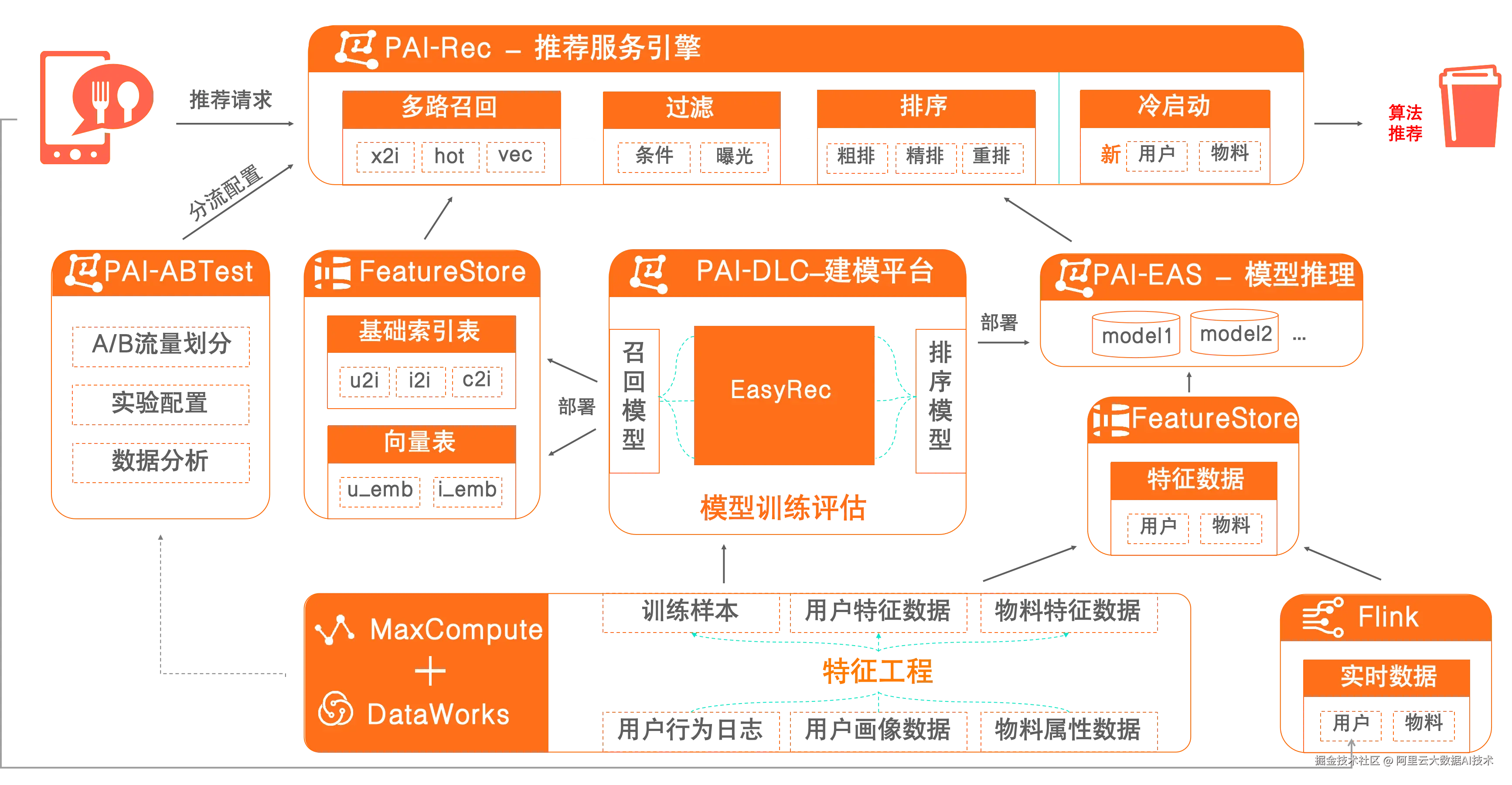 阿里云AI推荐方案是面向企业级场景的全托管推荐算法服务平台,深度融合阿里巴巴在电商、本地生活等高并发、高实时性场景下的推荐实践经验,提供从数据处理、特征工程、模型训练、测试验证到在线服务的一站式解决方案。