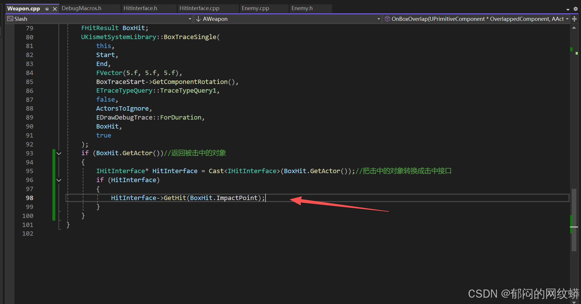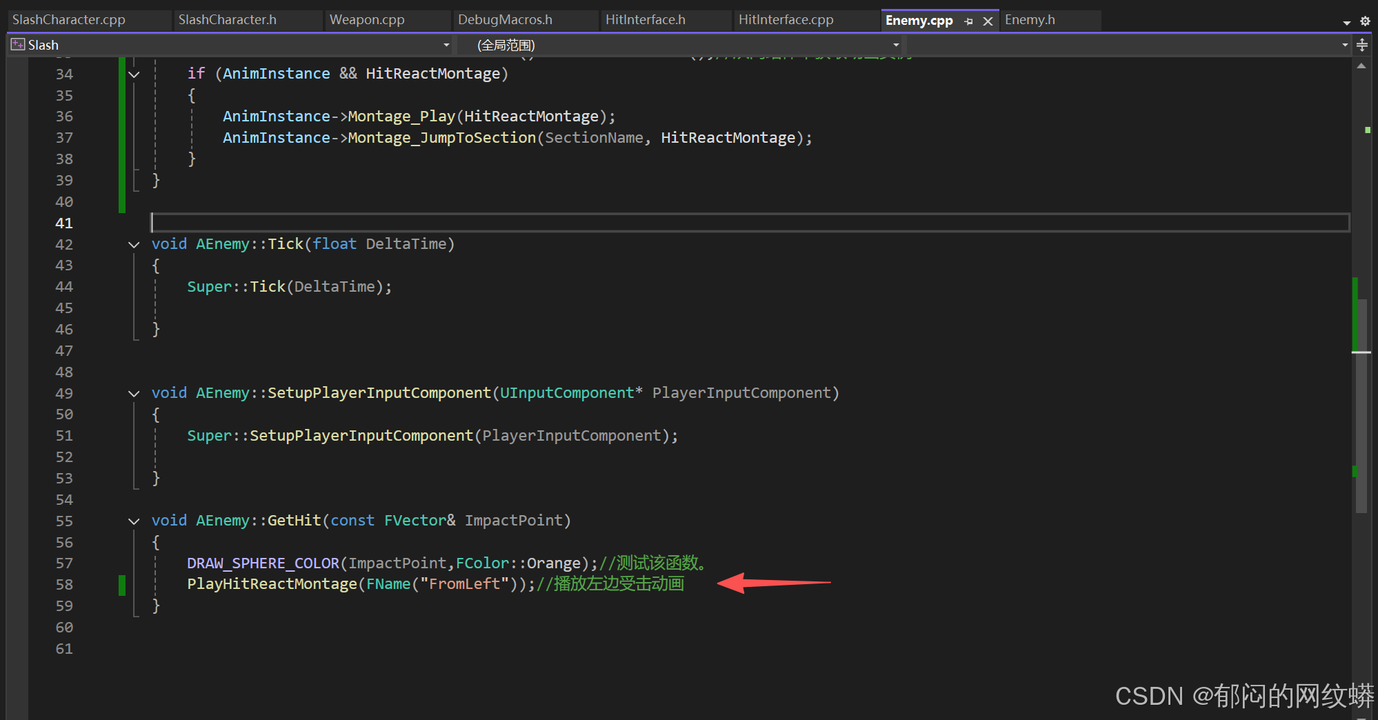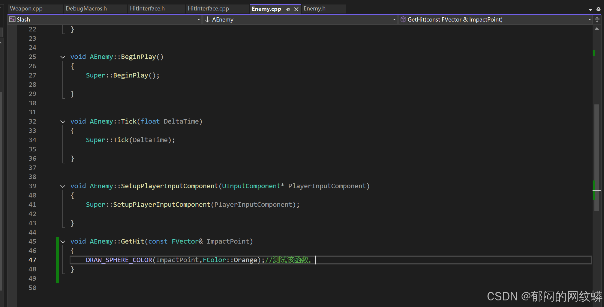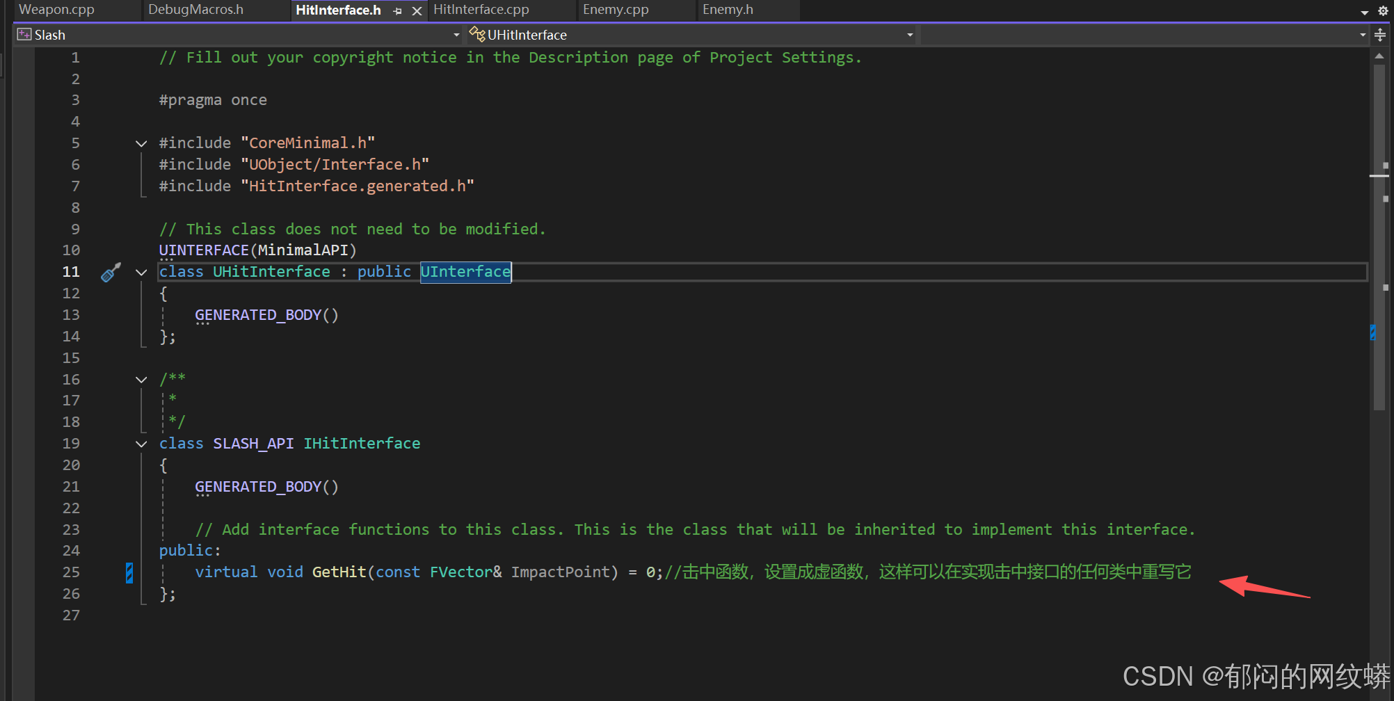 - 在C++里面敌人的代码要继承接口。有个技巧,把敌人写成既是角色也是IHit接口,这样更灵活。