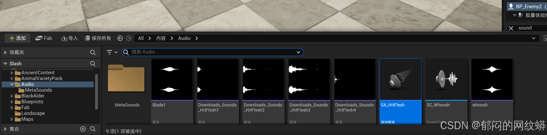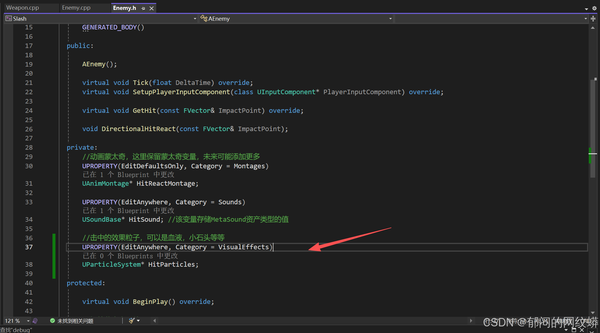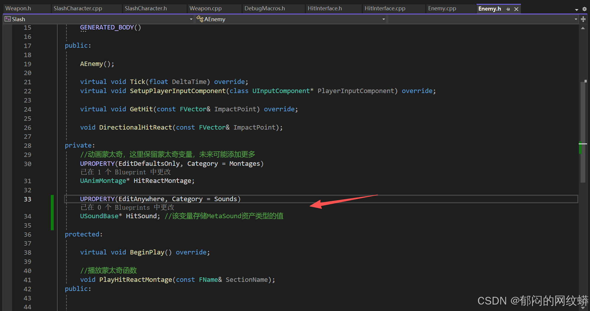 - 回到C++,进入敌人类,添加一个变量,用来存放敌人被击中的音效资产。