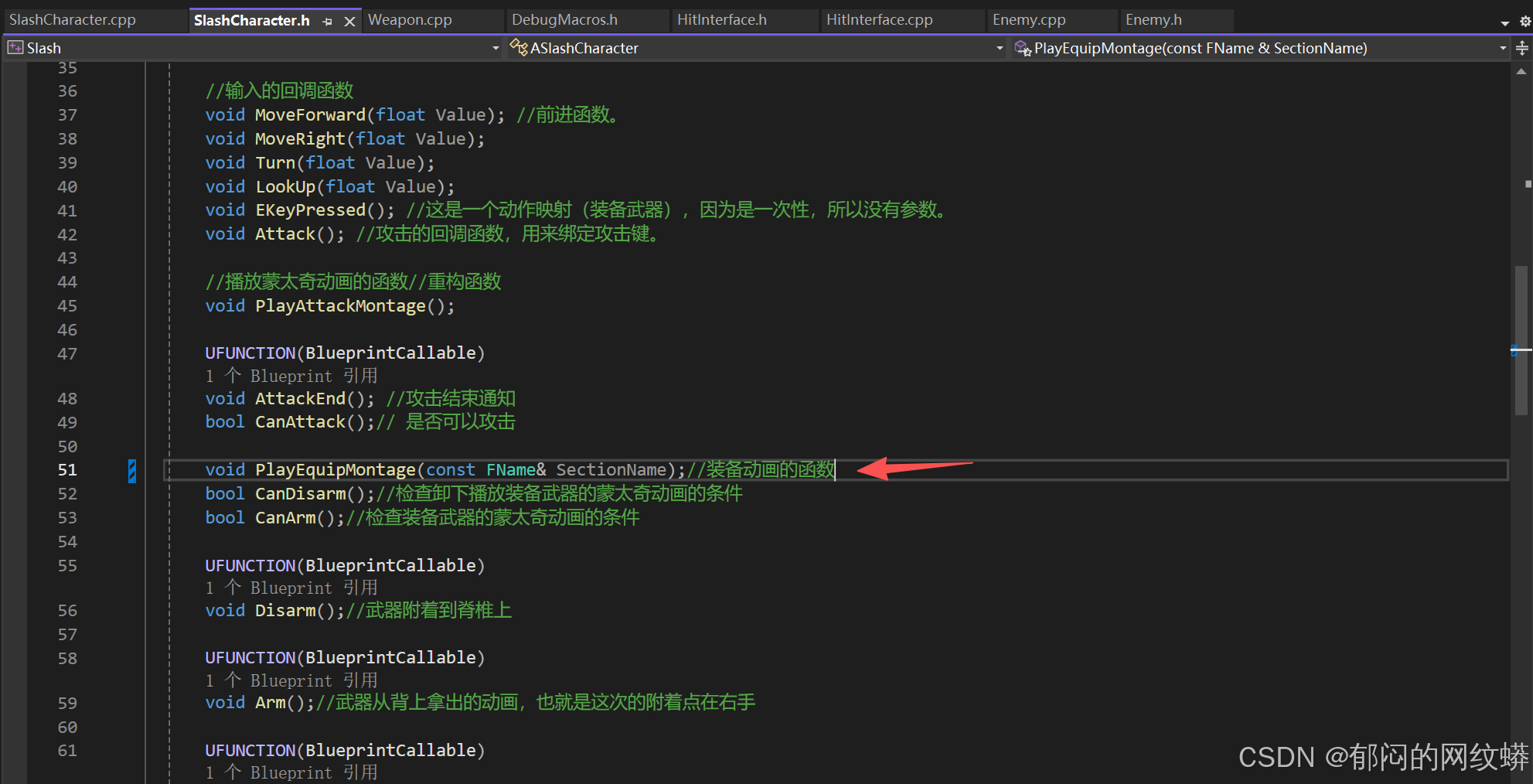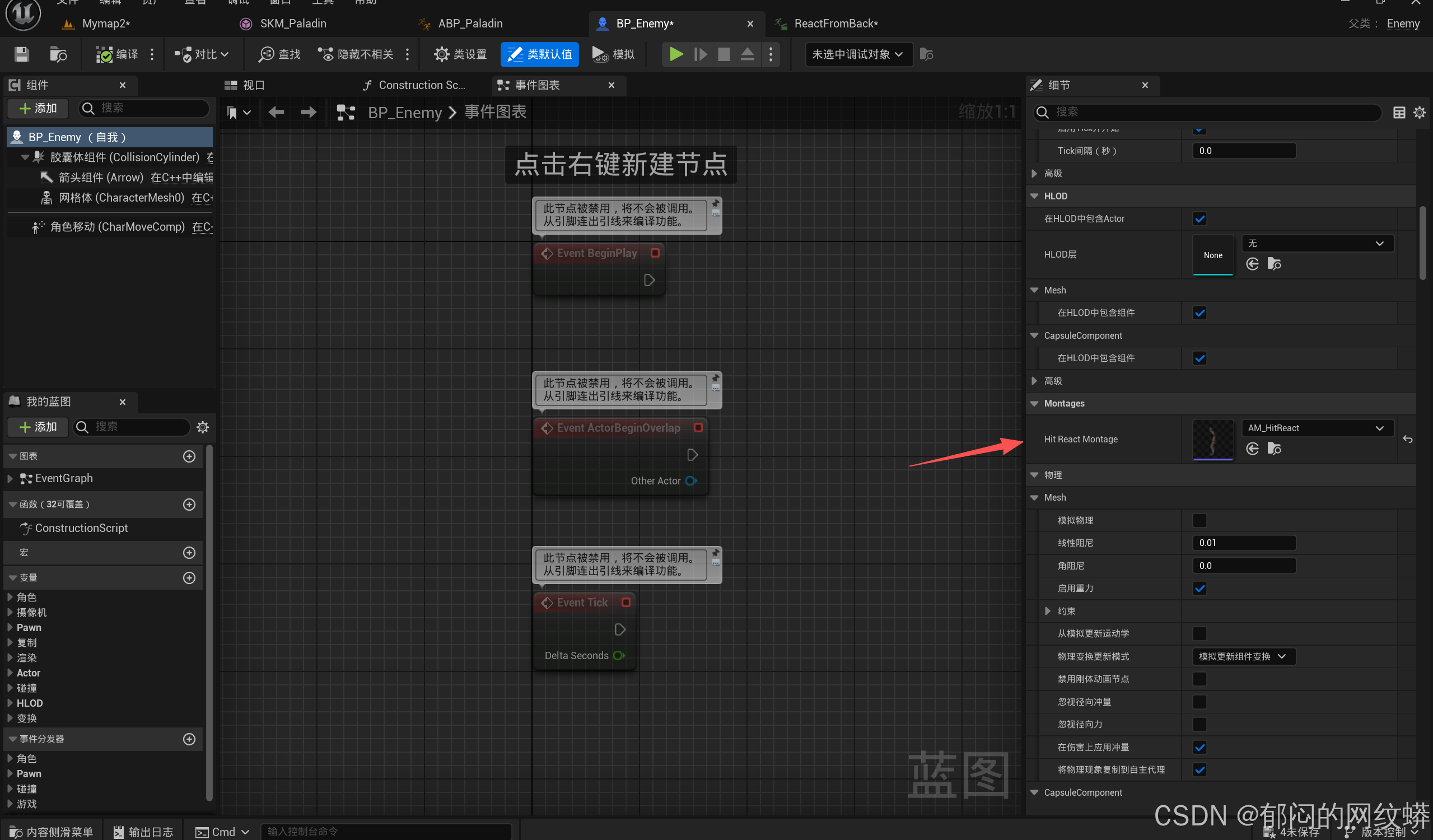 - 回到C++项目,进入敌人类,添加一个HitReact蒙太奇变量。