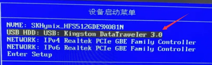 4,插入制作好的U盘启动盘,重启按F8调出启动管理对话框,默认因为是uefi的引导,所以要选择uefi开头的USB HDD识别到U盘启动进入PE回车;