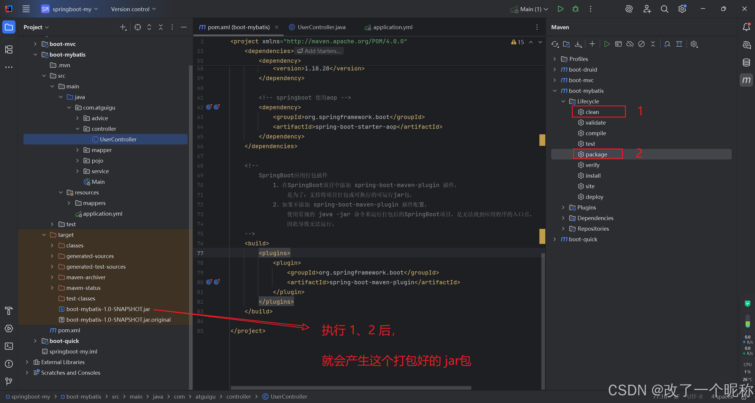 spring-boot-maven-plugin插件是为了支持将项目打包成可执行的可运行jar包。如果不添加spring-boot-maven-plugin插件配置,使用常规的java -jar命令来运行打包后的Spring Boot项目是无法找到应用程序的入口点,因此导致无法运行。