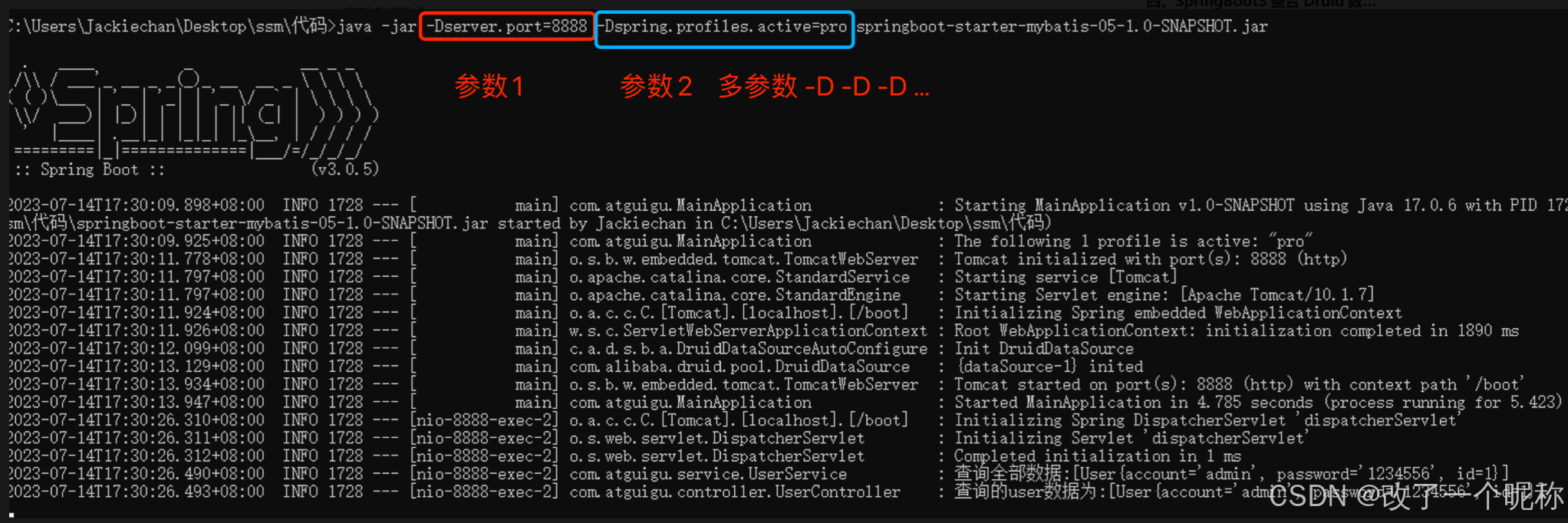 -Dspring.profiles.active=<profile>:指定Spring Boot的激活配置文件,可以通过application-<profile>.properties或application-<profile>.yml文件来加载相应的配置。例如: