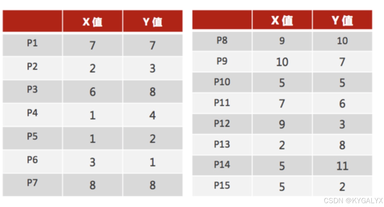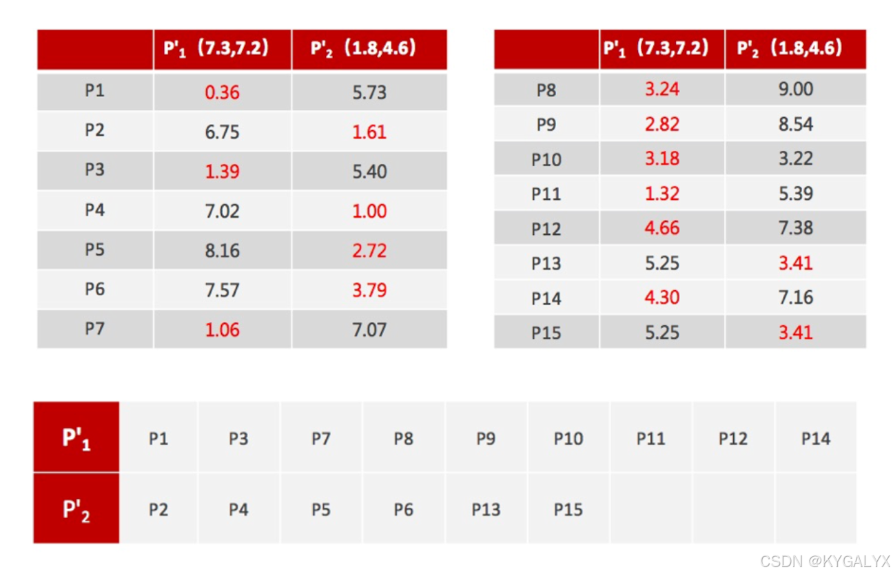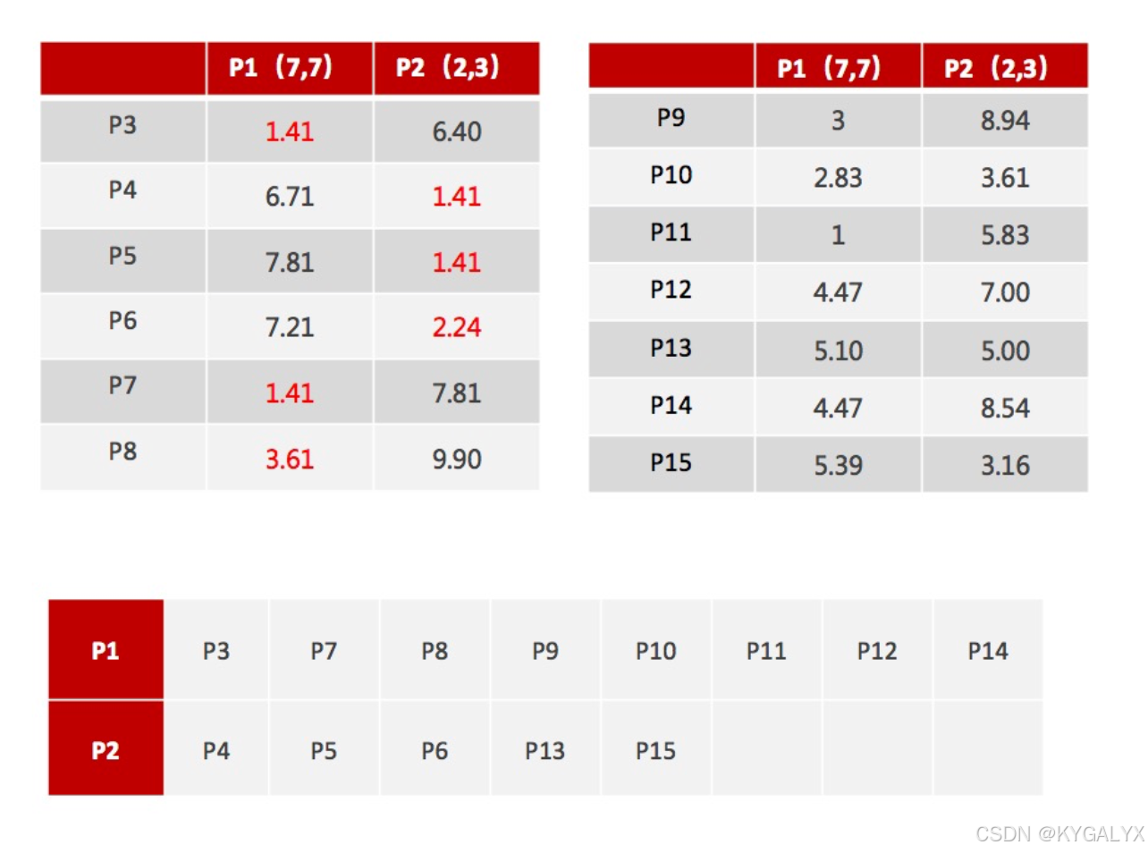 1、随机设置K个特征空间内的点作为初始的聚类中心(本案例中设置p1和p2)