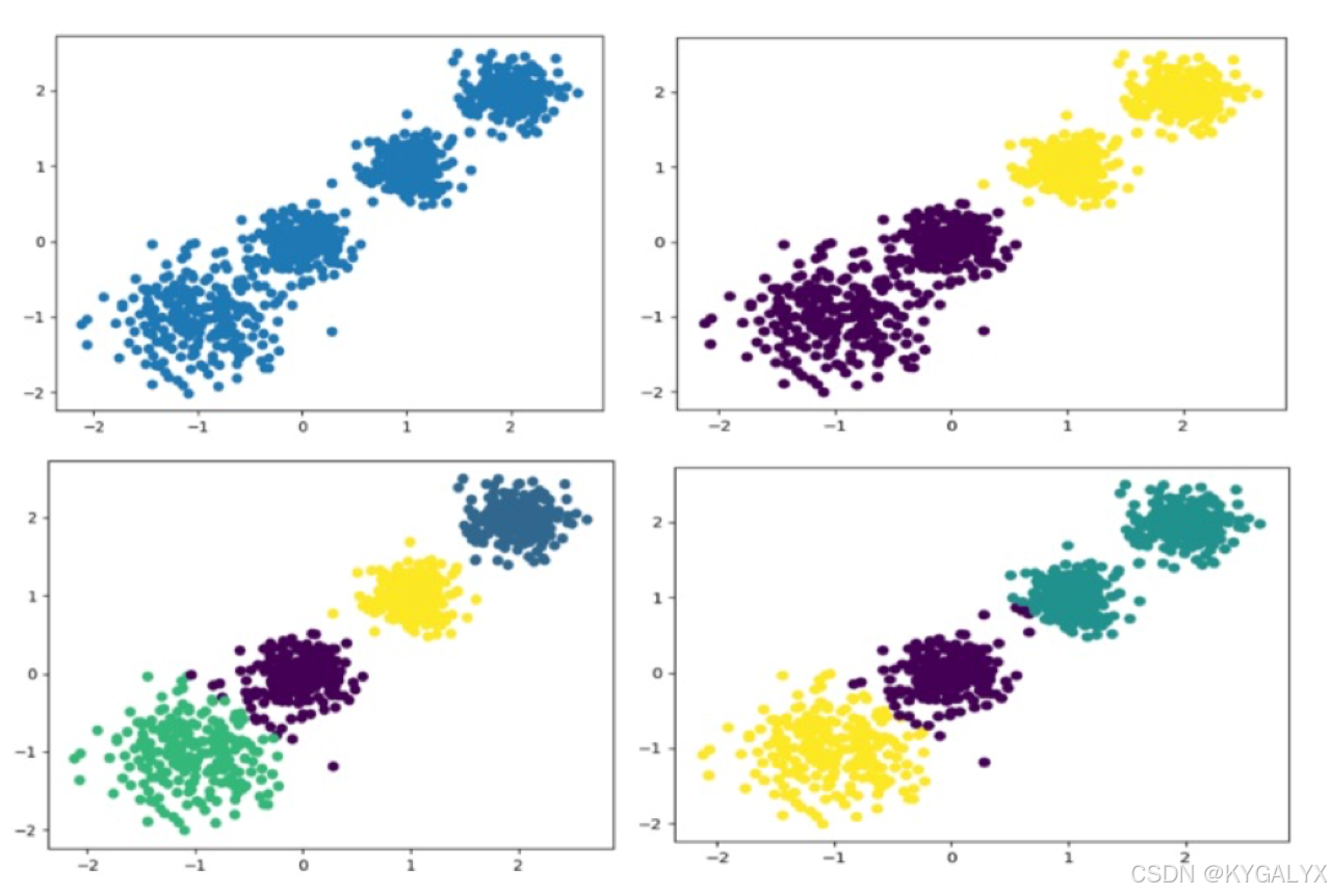 随机创建不同二维数据集作为训练集,并结合k-means算法将其聚类,你可以尝试分别聚类不同数量的簇,并观察聚类效果: