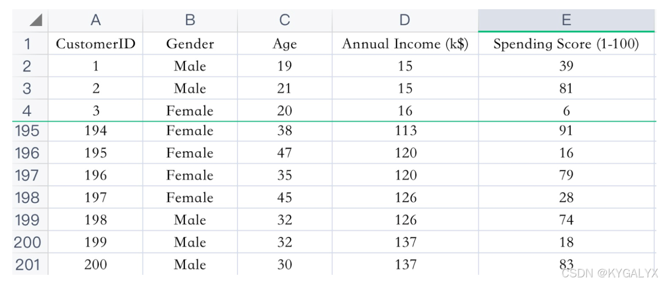 数据集共包含顾客的数据, 数据共有 4 个特征, 数据共有 200 条。接下来,使用聚类算法对具有相似特征的的顾客进行聚类,并可视化聚类结果。