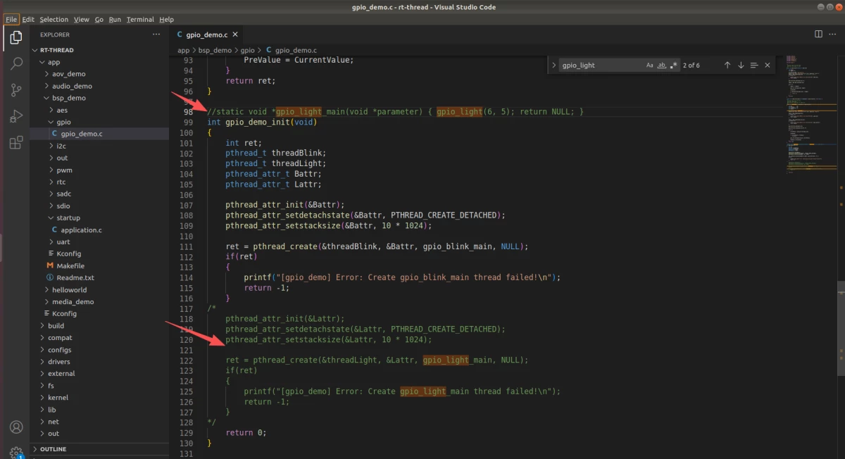 回到bsp_demo.c,这里的gpio_demo其实还有另外一个LED和按键功能,原理相似,我们暂不关注,所以先屏蔽一下,只启动一个点灯任务:threadBlink: