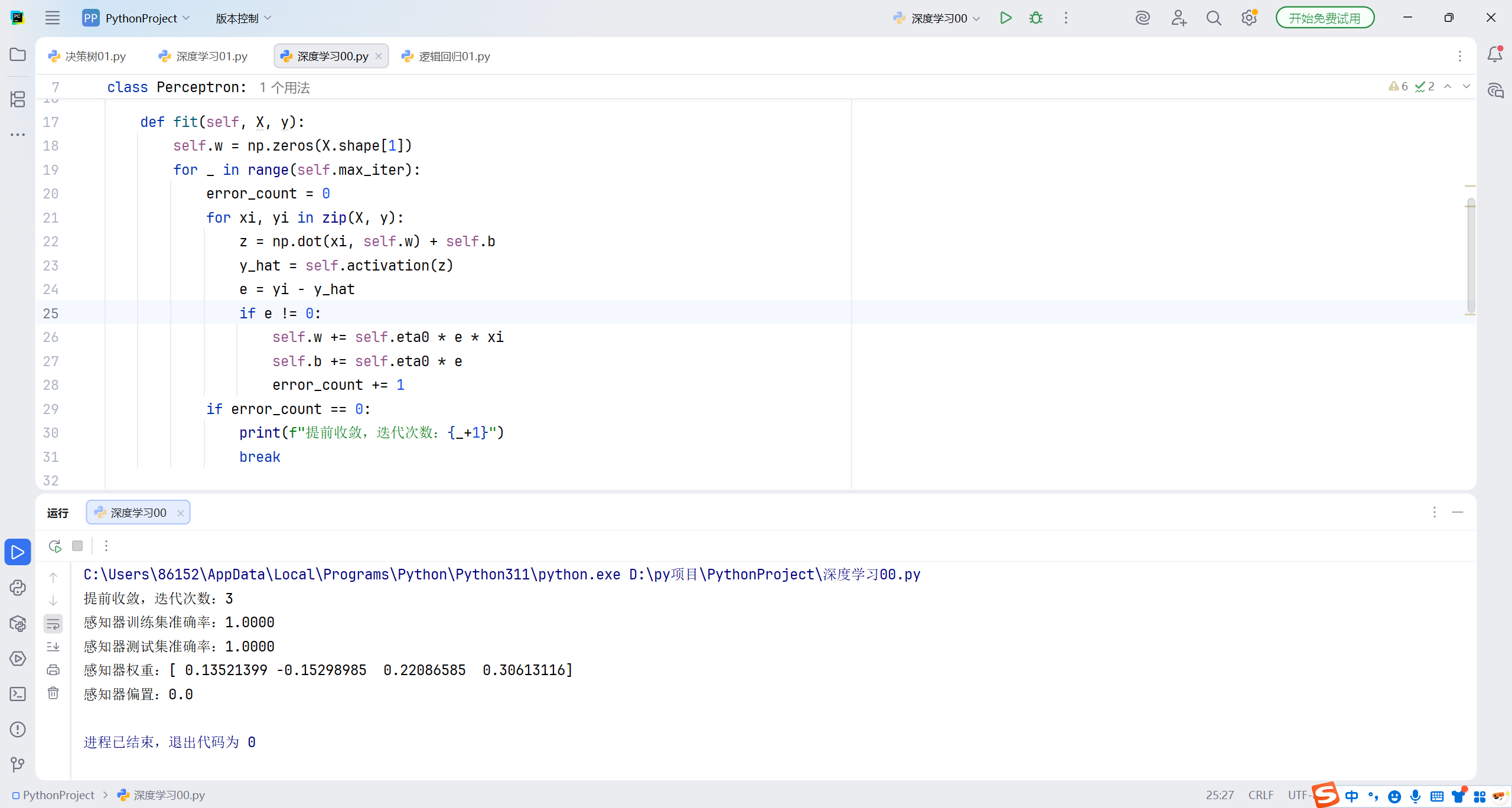 和 KNN 算法不同,感知器是有训练过程的模型,核心是通过误差调整权重和偏置,让模型的预测结果越来越接近真实标签。感知器的训练遵循错误驱动的原则,只有当预测结果出错时,才会调整参数,这也是后续反向传播算法的雏形。