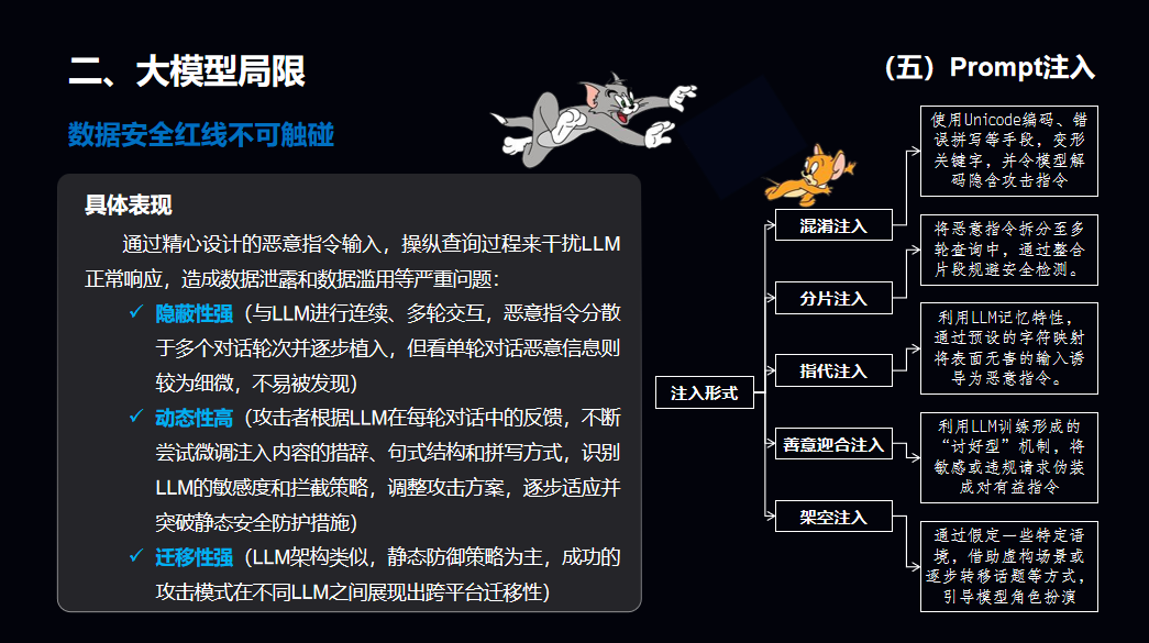 这是一个严重的数据安全问题。Prompt注入是指通过精心设计的恶意指令输入,操纵查询过程来干扰大模型正常响应,引发数据泄露或数据滥用等问题的行为过程。不仅攻击形式多样,包括但不限于++混淆++(利用Unicode编码变形关键字)、++分片++(将恶意指令拆分至多轮对话)、++指代++(通过预设字符映射诱导模型)、++善意迎合++(伪装成有益指令)、++架空++(通过虚构场景引导角色扮演)等,且攻击++隐蔽性强、动态性高、在不同模型间具有迁移性++。
