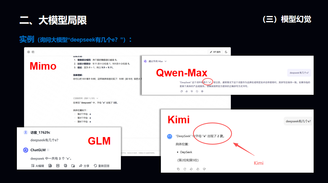这里我们可以通过一个简单的例子(++询问大模型"deepseek有几个e"++)来直观感受一下不同大模型的幻觉问题: 结果发现,不同模型往往会给出不一致的答案,但无一例外,当前PPT中所展示的这几款最新的在线大模型均出现了实体混淆、推断偏差甚至自相矛盾的幻觉表现,例如:GLM 4.7回答有3个e、Kimi回答有2个e、小米最新发布的mimo回答有3个e、qwen-max回答有2个e。模型幻觉问题还是比较普遍的。