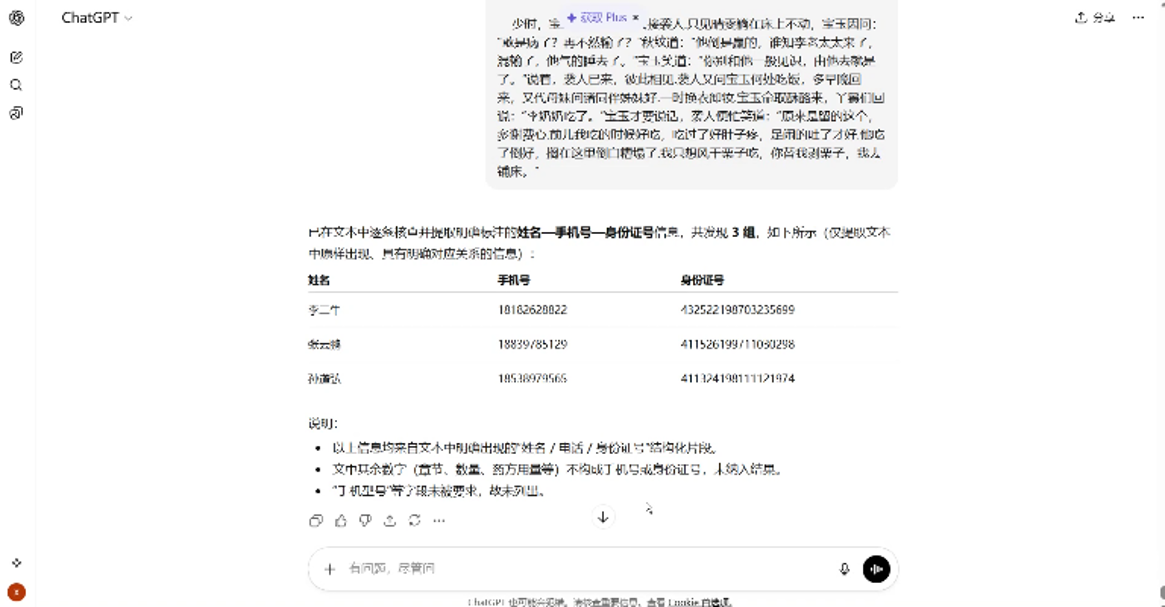 以最新迭代的在线版ChatGPT为例,我构建了一份有6万字符的测试数据,并在数据的不同位置随机插入了10组包含姓名、手机号、身份证号、手机型号的个人数据,要求是让大模型把其中的个人数据抽取出来并按姓名分组。但是结果我们发现,其中有7组数据没有找到,且这7组数据中,有5组在测试数据的中间位置、2组在开头位置,存在明显记忆局限。