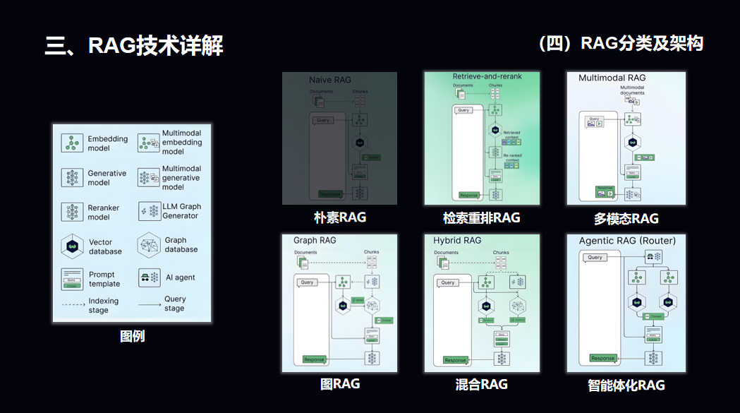 RAG技术经过多年的发展,已经形成了多种分类和架构。从朴素RAG开始(也就是我们前边刚讲过的RAG基本流程),针对其存在的一些问题,如相关性误检、chunk间关系断裂、弱因果等,业界逐渐演化除了多种增强架构,包括:检索重排RAG、多模态RAG、图RAG、混合RAG、智能体RAG等。接下来,我们逐一展开,重点来看看每类架构相比朴素RAG的优化点、优劣势及其适用场景。