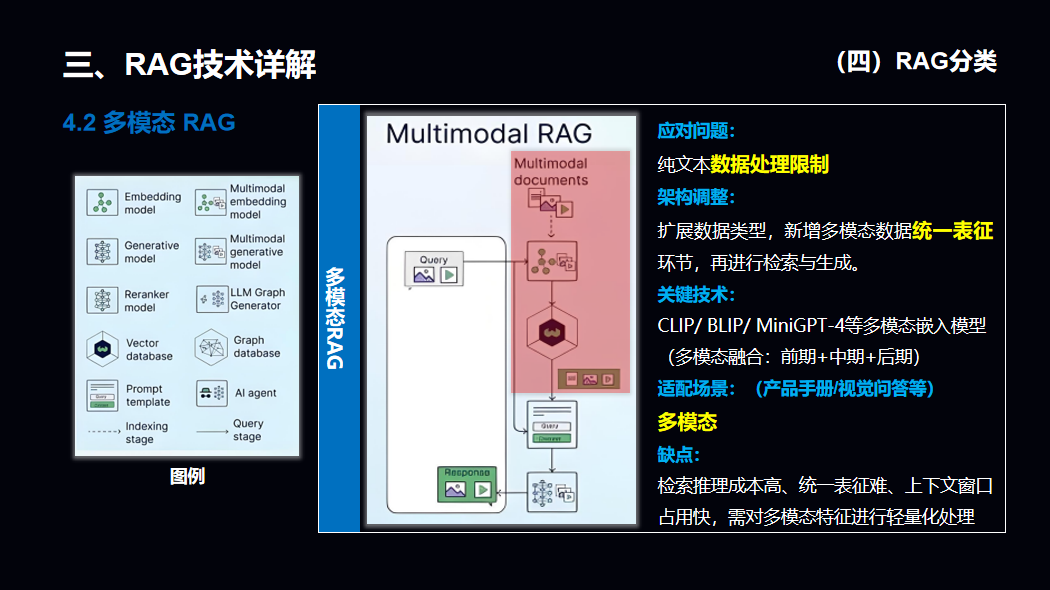 朴素RAG仅支持文本检索,无法处理图像、表格、音频等多模态数据。多模态RAG则通过引入多模态编码模型(如CLIP、BLIP)对图像、文本等进行统一表征,将不同模态的数据映射到同一向量空间,++实现跨模态检索++。例如,用户可上传产品图片查询使用说明,系统从图文混合知识库中检索相关信息并生成回答。该架构适用于产品手册解析、视觉问答、教育资料检索等场景。