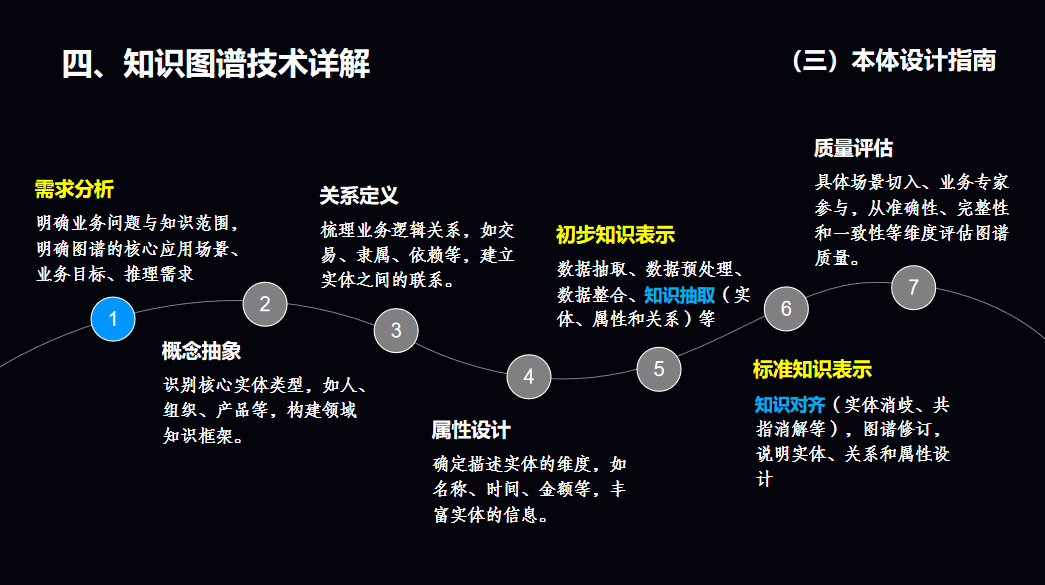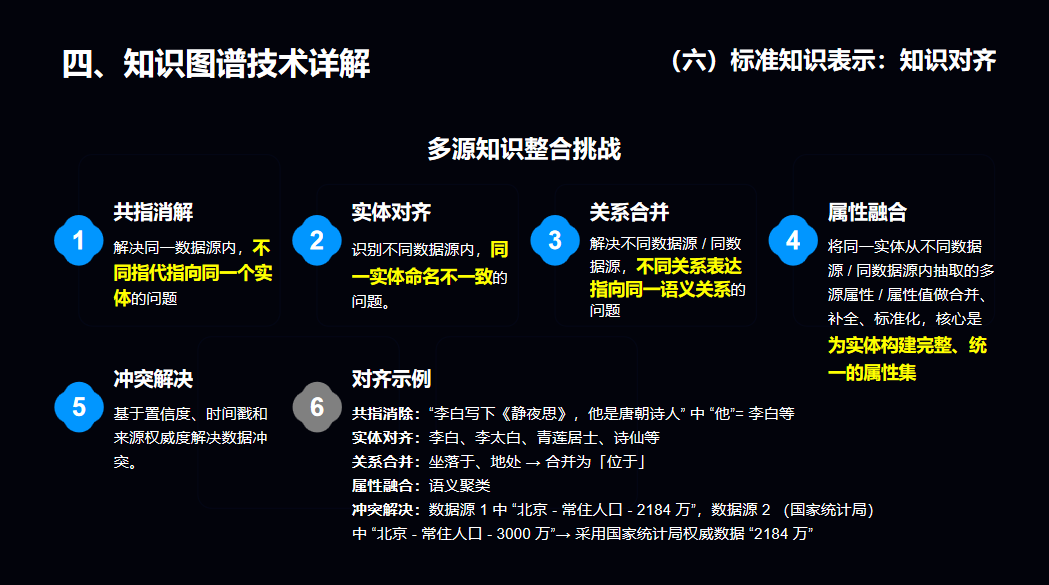 - **第六步,标准知识表示。**进行知识对齐(实体消歧、共指消解等),图谱修订,明确实体、关系和属性的设计规范。