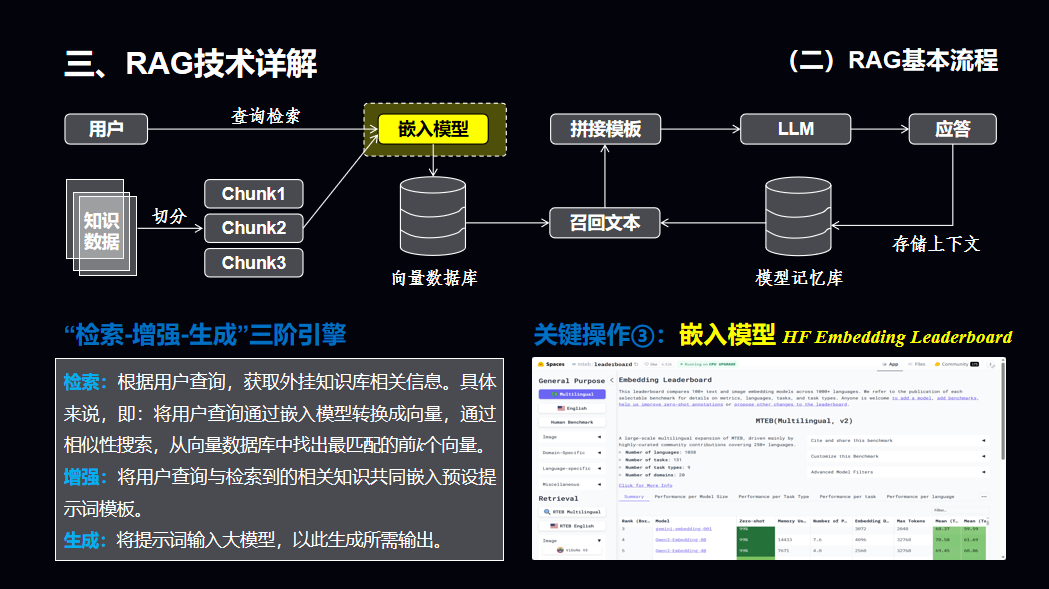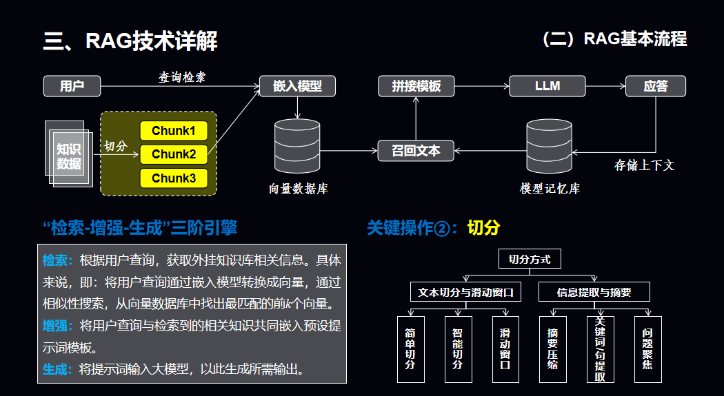 - 举个例子:当用户提出某个问题时,RAG系统会先通过嵌入模型将用户查询转换成向量。接着,进行过相似性搜索,从向量数据库中找出最匹配的前k个向量,这些向量对应着知识库中的相关文本片段。当检索到的文本片段被召回后,再与用户查询一起嵌入到预设的提示词模板,并被输入到大模型,大模型基于这些信息生成回答。