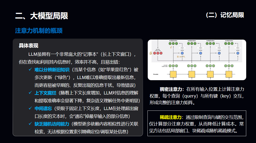 由于注意力机制本身所存在的局限,这里指的主要是稠密注意力,大模型可支持的上下文窗口十分有限,存在明显的记忆局限,主要体现在4个方面: