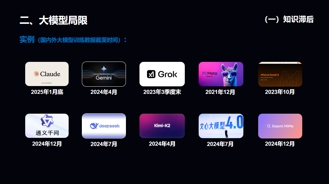 大模型的知识是固化于训练数据截止日期前的静态世界,模型本身无法自动获知和整合现实世界中的新变化,知识相对滞后。 具体体现在4个方面: