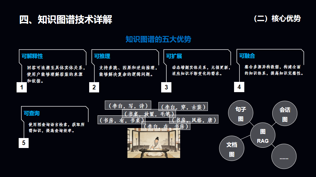 - 第五,可查询。使用图查询语言检索,如Cypher获取所需知识,提高查询效率。 特别的,在图RAG中,知识图谱的构建并不仅仅局限于文本数据,也可使用图等非结构化数据。例如,当前PPT中心李白写诗的这张图,我们可以抽取到若干三元组,(李白,写,诗)、(书房,有,书桌)、(书桌,放置,毛笔)、(李白,在,书房)等等,只不过难点就在于如何从图中抽取出这些语义信息。