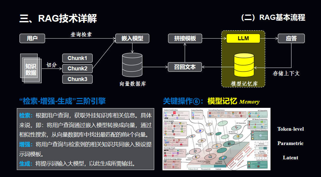 - ++二是参数级记忆,++这种方法主要指通过预训练或微调固化在模型参数中的知识,属于长期记忆。例如,模型在训练中学到的语法规则、常识知识、专业术语等。这类记忆稳定存在,但更新成本高,无法实时调整。