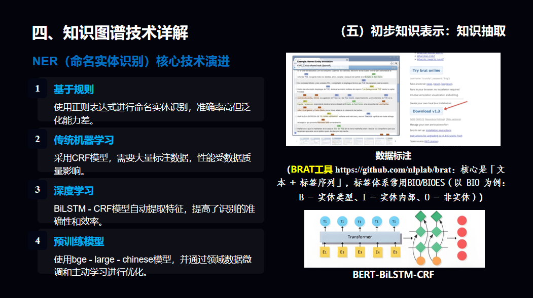 - 进入深度学习阶段,BiLSTM-CRF等模型实现了特征的自动学习,大幅提升了识别精度与效率,但依赖与标注数据。通常借助BRAT等工具,按照BIO/BIOES等标签体系对文本进行序列标注;