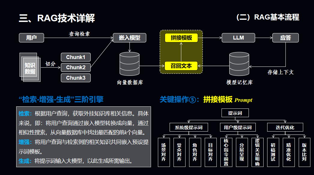- 增强负责将查询与检索结果嵌入提示词模板;