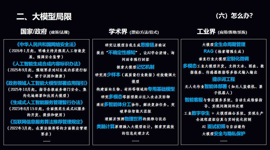 - 工业界则通过垂直模型微调、多模态系统、智能体部署等方式推动技术落地。