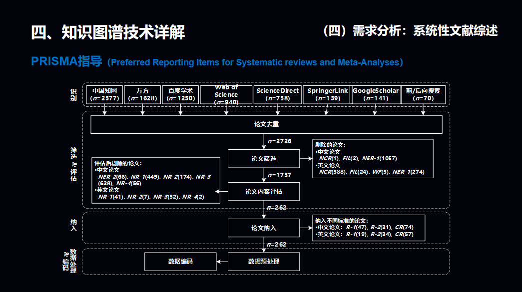 PRISMA指导思想,包含5个步骤: 1、制定明确的、可量化的识别、筛选&评估、纳入、数据处理&编码标准; 2、识别(多数据库); 3、筛选与评估; 4、纳入(分类分级); 5、数据处理&编码;