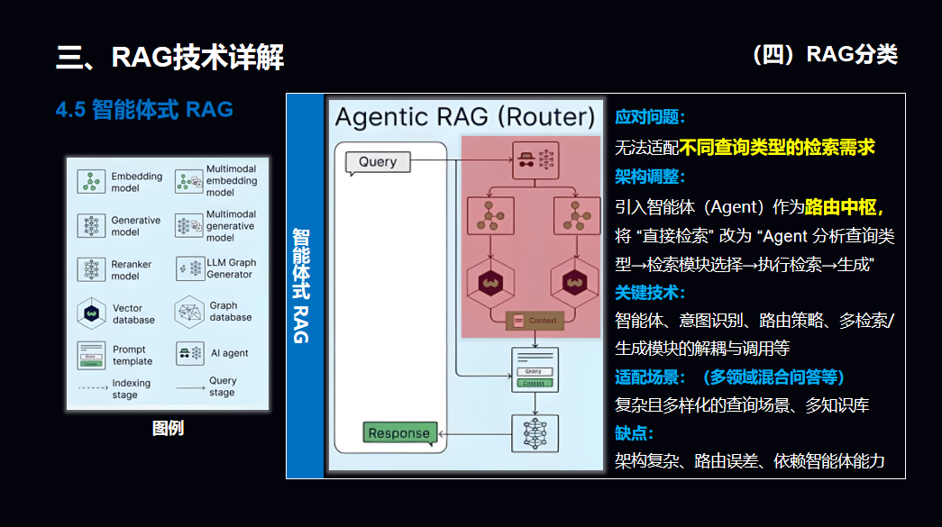 朴素RAG采用固定检索策略,无法根据查询意图动态调整。智能体式RAG则引入智能体(Agent)作为决策中枢,通过意图识别、路由策略分析用户查询,动态选择最合适的检索模块(如向量库、图谱、文档库等),并可借此在多轮对话中维持记忆与状态。该架构适用于查询类型复杂、多知识库协作的场景,如跨领域知识问答、任务型对话系统等。其优势在于灵活性与可扩展性,但依赖智能体的决策能力,若路由判断失误,可能引发连锁错误,且系统架构较为复杂,部署和维护门槛较高。
