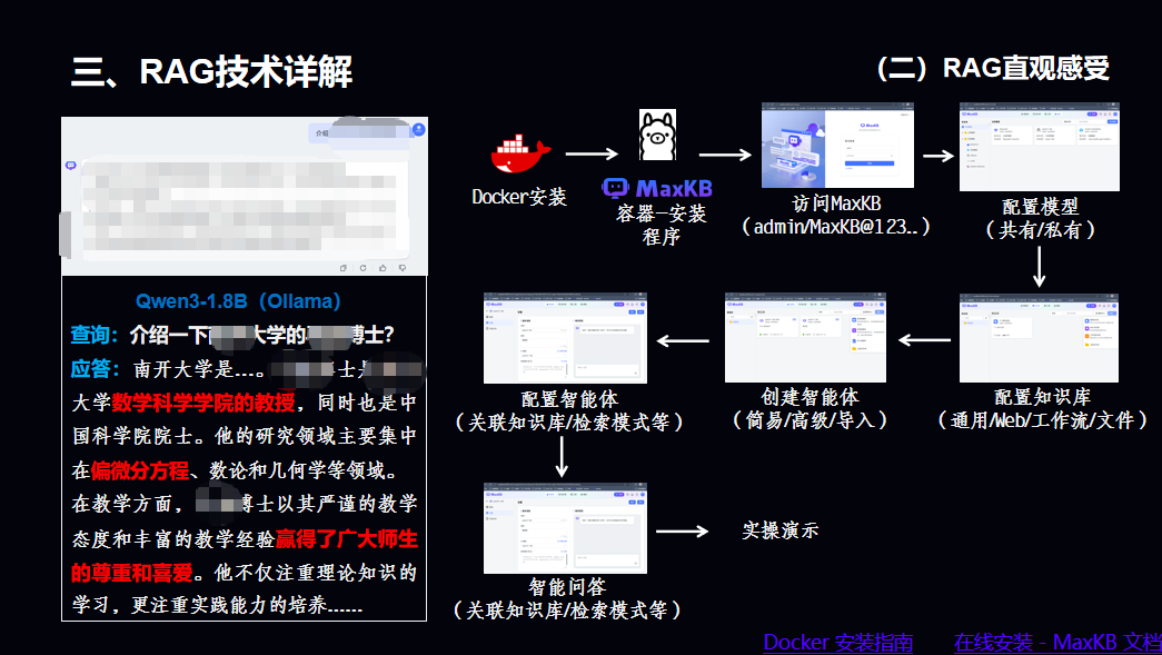 上边MaxKB就是一个很好的案例,大家可以尝试进行RAG搭建。相关的指南可参考:在线安装 - MaxKB 文档
