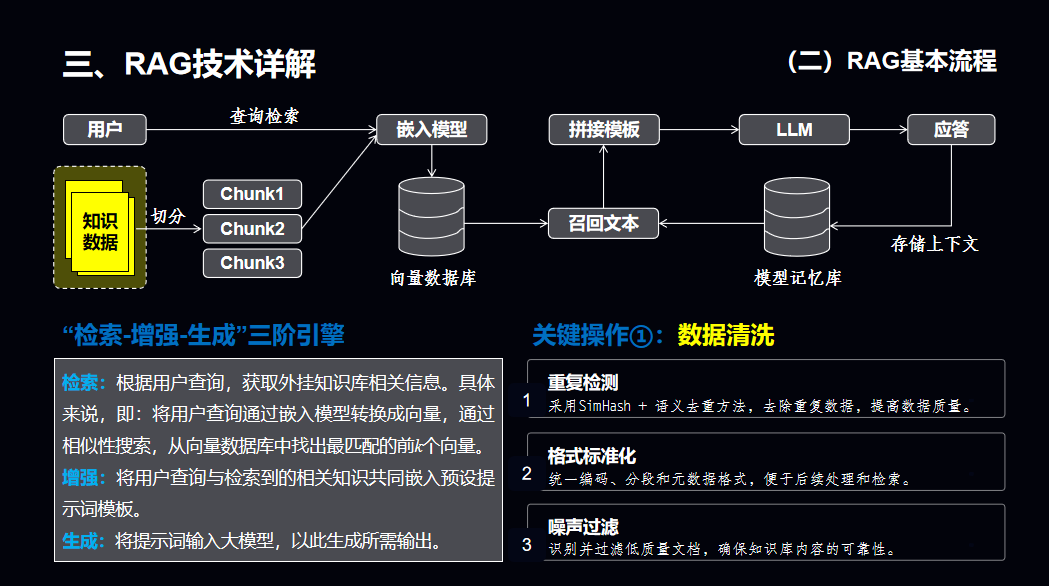 在这个过程中,有几个关键操作需要大家格外留意: 第一,数据清洗。 如果把RAG比作一条智能生产线,那么数据就是产线上原材料,而数据清洗就是确保原材料纯净、可用、高质量的第一道工序。如果输入系统的知识数据本身存在大量噪音、格式混乱、错误或不一致,那么无论后续的检索与生成模块再怎么强大,最终的输出质量都会大打折扣。此外,大家还需要知道,++数据清洗他不是一个一次性的环节++,而是应该贯穿知识库构建与维护的全过程,根据业务需求、数据现状等动态调整。具体,有三个处理方向供大家参考: