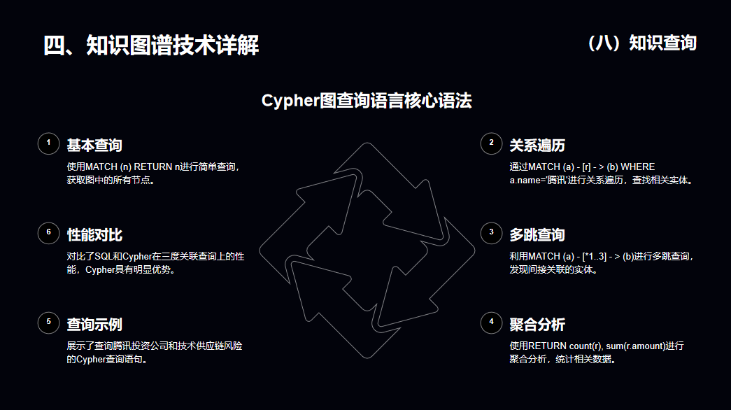 - 关系遍历:通过MATCH (a)-[r]->(b) WHERE a.name='腾讯'进行关系遍历,查找相关实体。