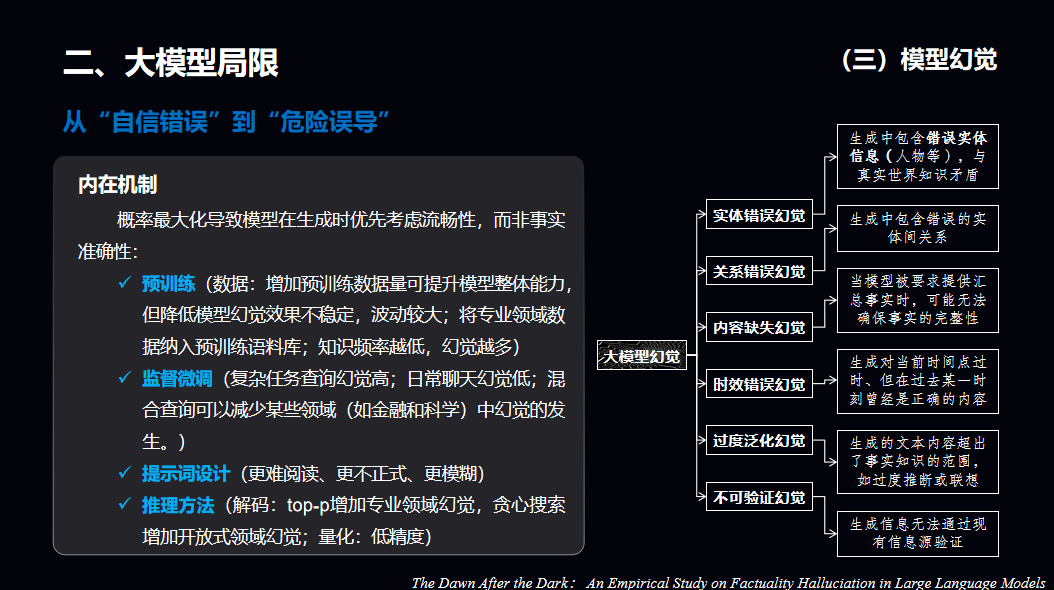 ++幻觉的表现形式++有实体错误幻觉、关系错误幻觉、内容缺失幻觉、时效错误幻觉、过度泛化幻觉、不可验证幻觉等多种类型,且每类的表现也略有差异,应对方式也有所不同,在实际业务中我们不能泛泛的只谈幻觉。例如:实体错误、关系错误问题可考虑知识图谱,内容缺失、时效错误可考虑增加数据,过度泛化、不可验证问题可考虑提示词工程、调参,具体根据需求自行进行选择与取舍即可。