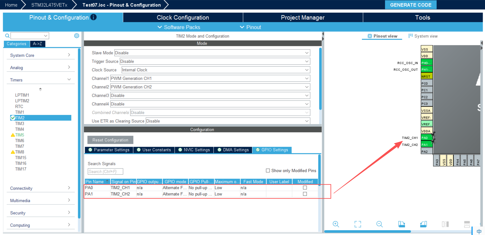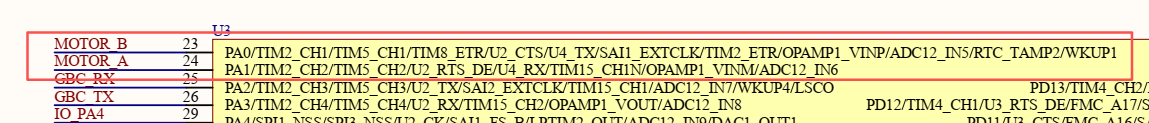 根据原理图, PA0和PA1为驱动电机的两个引脚, 所以在GPIO这里配置TIM2的硬件通道对应引脚为PA0和PA1