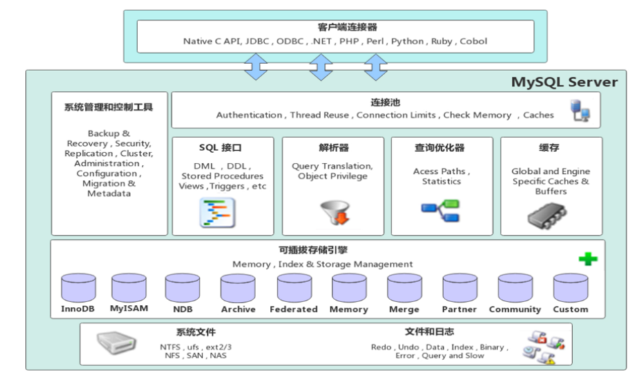 最上层是客户端与服务器的连接服务,核心职责是处理客户端的连接请求,完成身份认证 和权限校验,同时提供线程池管理、SSL 安全连接等能力。
