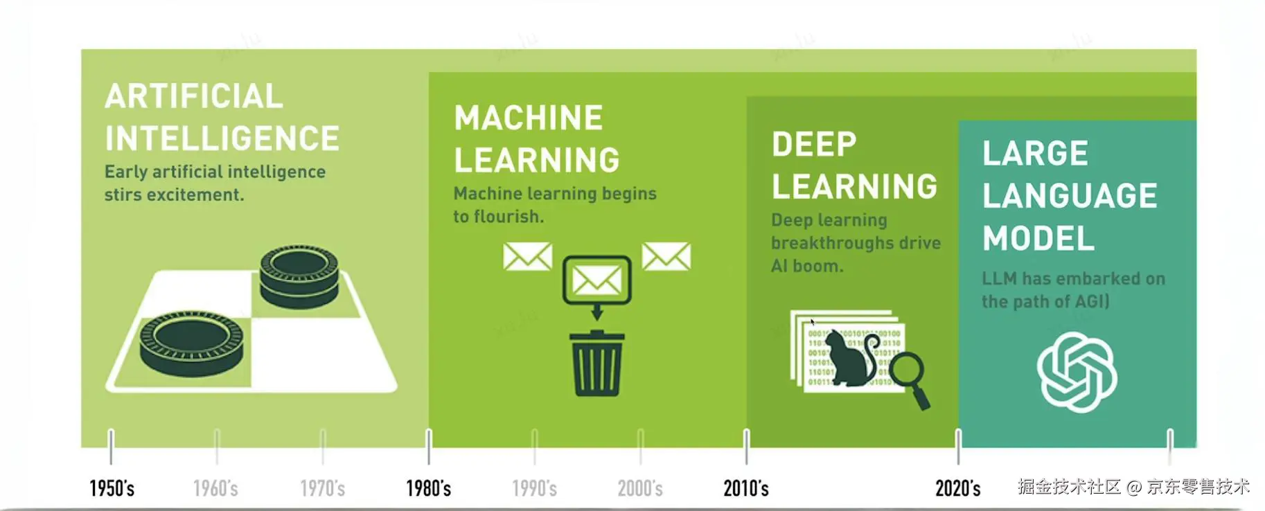AI 本质就是 "让机器像人一样思考、干活" 的技术体系------不用人一步步指挥,机器能自己学规律、做决策。比如手机人脸识别、聊天机器人、自动驾驶,都是 AI 的具体应用。它不是单一技术,而是一堆技术的 "总称",就像 "家电" 包含冰箱、电视一样。这张网上流行的图概述了人工智能(AI)随着时间推移的发展历程,从早期阶段到机器学习、深度学习以及大型语言模型(LLM)的出现。