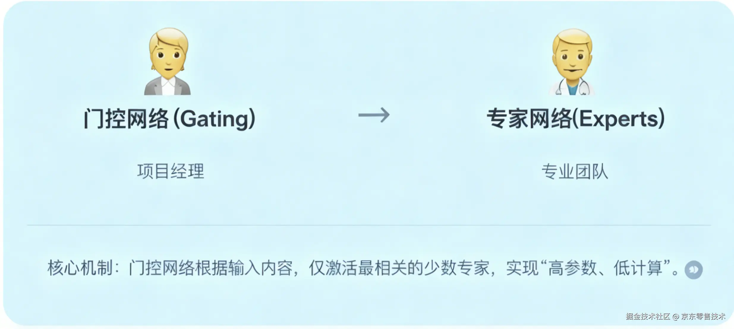 2)门控网络:医院导诊台,输入任务后先 "判断任务类型"(如 "怎么写 Python 代码" 属于编程任务);接收输入任务后,通过计算判断任务类型,筛选出最适合处理该任务的 1-2 个专家模块;