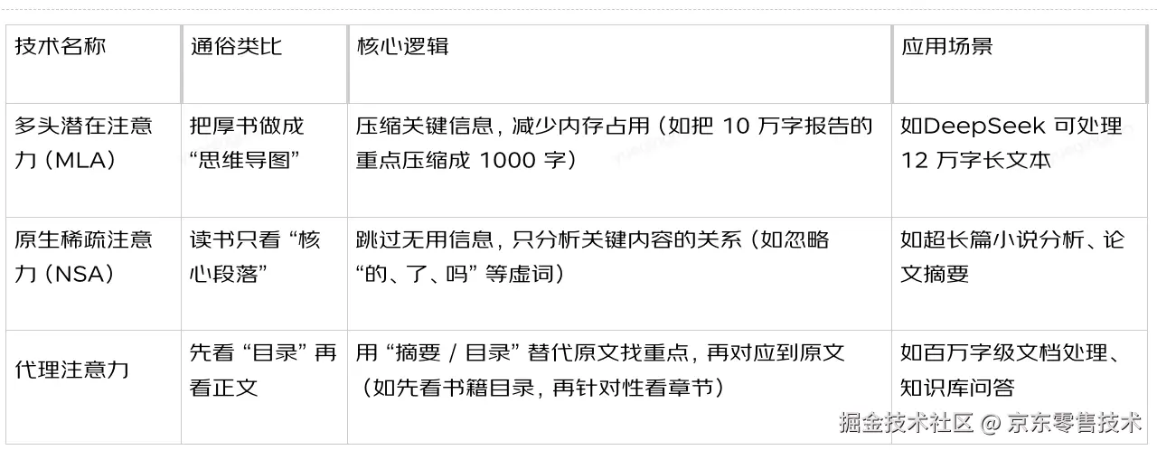 普通注意力机制处理长文本(比如 10 万字报告)时,会 "内存不够、跑不动",这三个是 "优化版",核心是 "省资源、提效率":