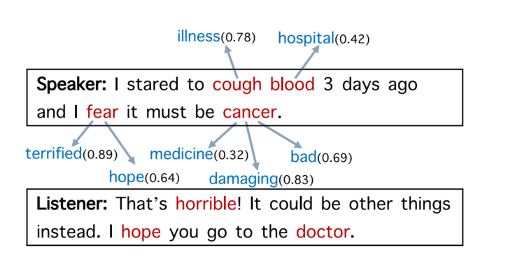 - 图一中是利用取自EMPATHETICDIALOGUES的外部知识进行共情对话的例子 ,对话中与情感相关的词语以红色突出显示,而与情感相关的概念以蓝色标记,括号中的数字表示情感强度值。
