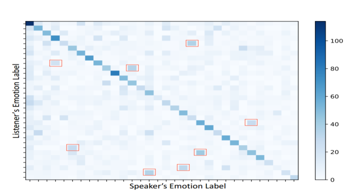 - 图三表示从说话者到听众的情感转换。在图3中,较暗的对角线网格显示听众倾向于反映对话者的情感以建立融洽关系。除了对角线方向之外,(红色框中)还存在一些复杂的情感转换模式,因此,对对话者之间的情感依赖进行建模至关重要。