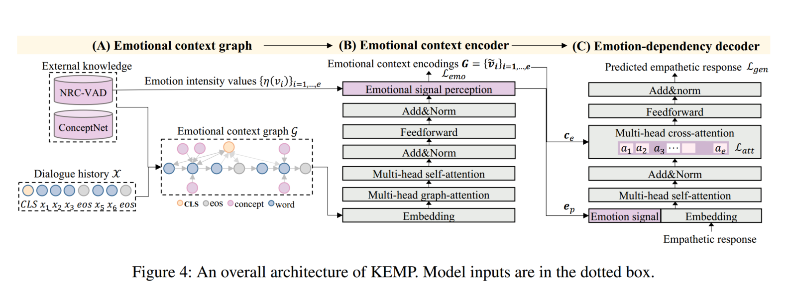 KEMP的总体架构如上图所示,情感上下文图 (Emotional Context Graph)、情感上下文编码器 (Emotional Context Encoder)、情感依赖解码器 (Emotion-dependency Decoder)分别对应图中的(A)、(B)、(C)阶段。