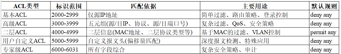 - 数字型ACL:传统的ACL标识方法,创建ACL时,指定一个唯一的数字标识该ACL。