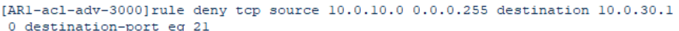 - 在模拟器上,在AR1上配置高级ACL,默认允许,需要访问的就不用写了,五元组信息: 源IP-10.0.10.0/24; 目的IP: 10.0.30.1;协议:ftp;源端口:随机生成;目的端口:21(ftp的端口号)