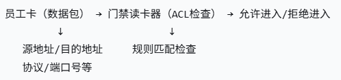 inbound 流经路径:[外部] -> 接口 -> ACL检查 -> 路由器处理。影响访问路由器自身的流量,接口收到时就过滤,节省资源。 outbound 流经路径:路由器处理-> ACL检查 -> 接口-> [外部]。不影响路由器自身流量,先路由再过滤,可能浪费资源。 - 分类与标识: