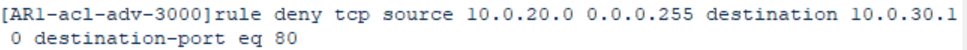 协议-TCP(ftp是基于TCP协议工作,控制ftp,实际是在控制tcp流量),源IP网络段,目IP,通配符,目的端口号。 - vlan 20 访问server 1的http流量匹配并拒绝放行: