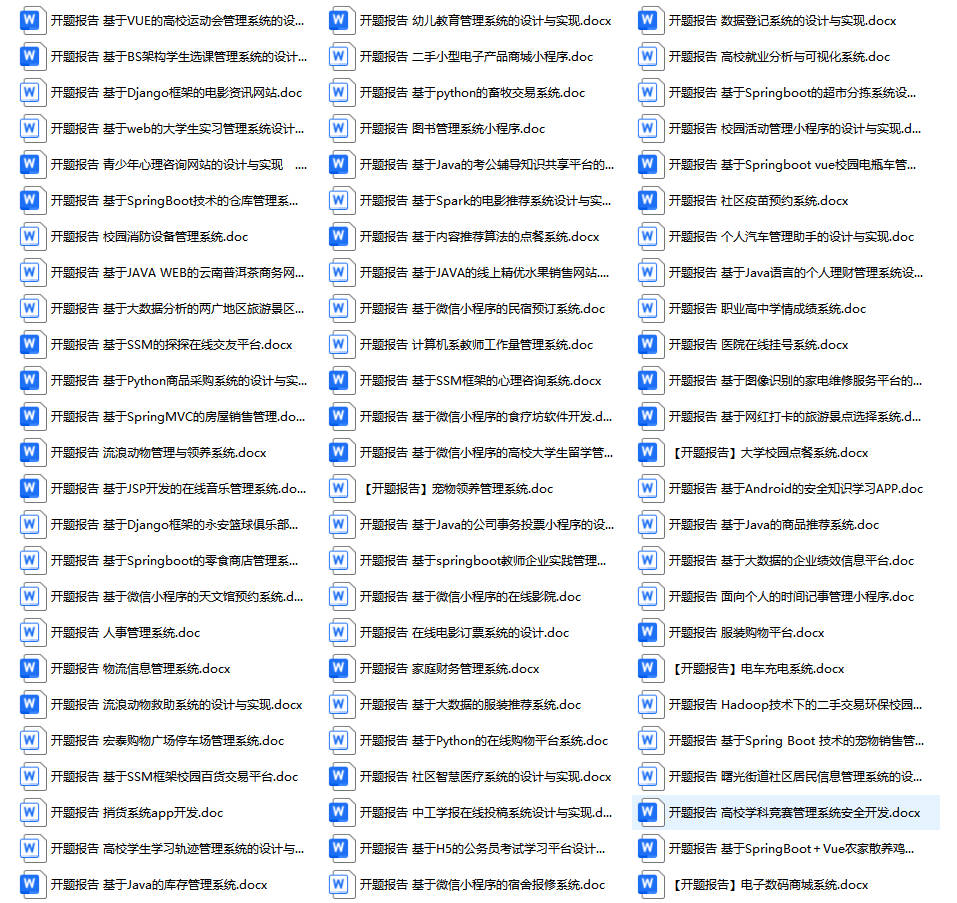 以上是某同学的毕业设计答辩的过程,如果你现在还没有参加答辩,还是开题阶段,已经选好了题目不知道怎么写开题报告,可以下面找找有没有自己符合自己题目的开题报告内容,列表中的开题报告都是往届真实的开题报告,可发送使用或参考。文末或底部来联xi可免费获取