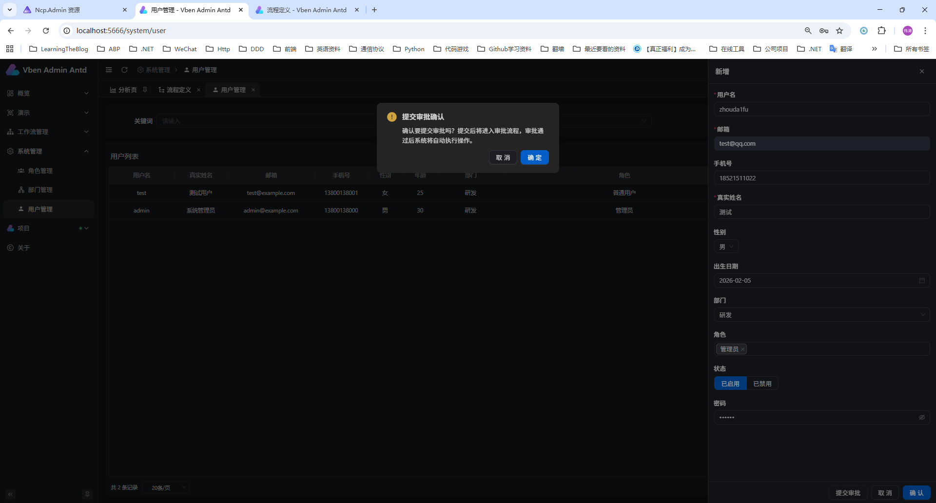 项目已经有完善的用户、角色、部门、权限管理模块。本次需求是在现有架构基础上,增加一套 审批工作流系统 ,支持流程定义、流程发起、多级审批、驳回、转办等能力,并实现 "新增用户需走审批流程" 的业务闭环。