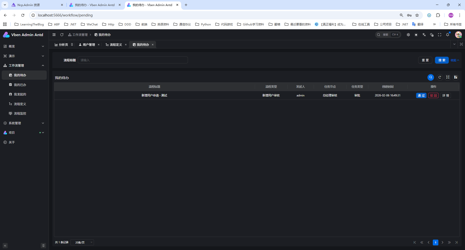 审批人的待办任务在 工作流管理 → 我的待办 中处理:
