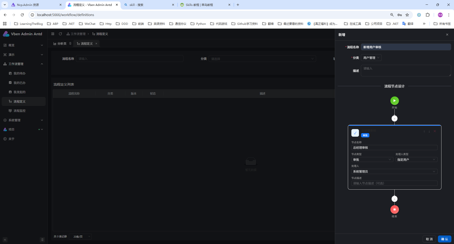 - 点击 新增,打开流程定义表单。